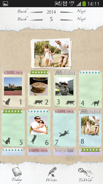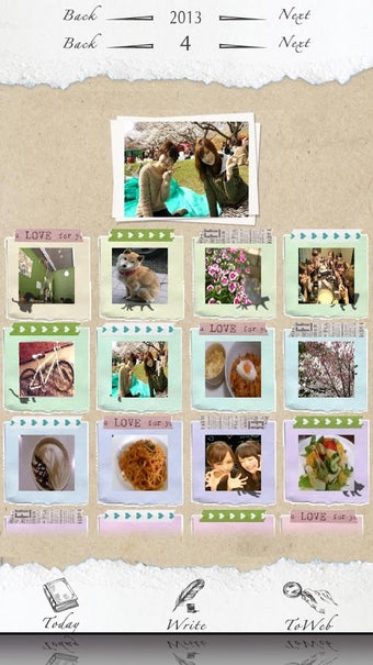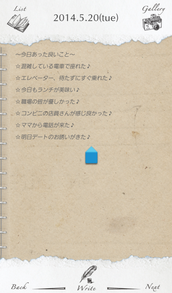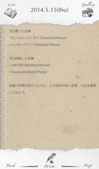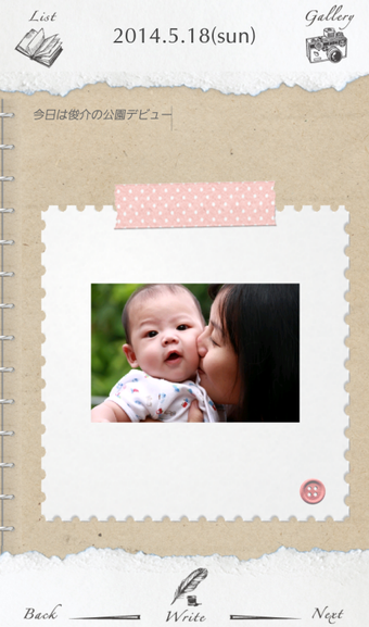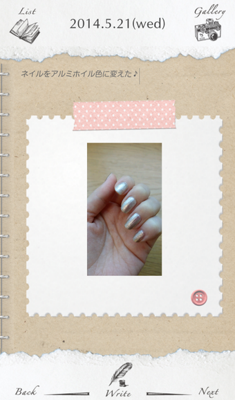 日記を書く際、メニューボタンから文字の大きさを変更できるので、見づらいな、書きづらいなと思ったら調節しましょう。画面右上の「Gallery」からは端末に保存されている写真を日記上に載せられます。写真はコラージュ風に表示され、手作り感のあるデザインだと感じました。ただし、表示される写真は比較的小さく、表示サイズも変えられないため、写真をメインとした日記の場合は、やや不便に思うかもしれません。