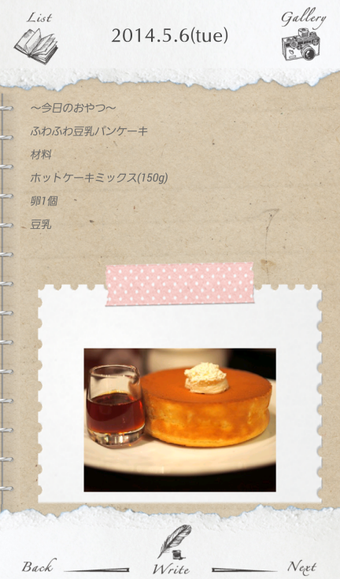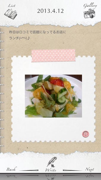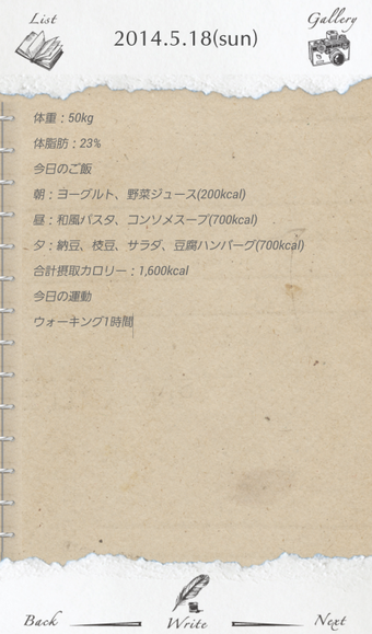 My日記(マイ日記)では、ヴィンテージ風の手書き日記帳のようなデザインで、日々のできごとを記録できます。文字数の制限もなく、写真も貼り付けられるので、お出かけ時のファッションコーディネートやその日作った料理のレシピの記録、レコーディングダイエットなど様々な使い道があります。
